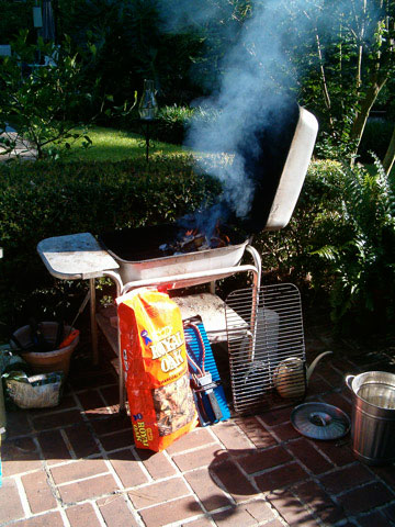 We've had close, personal relationships with a couple of Weber grills, too. And appreciate the fact that they are easy-to-use, and clean up well. The small Weber is the ticket to the Alton-Brown-instant-smoker, a trick we got while watching the Food Channel. We'll write more about that later, when we quit being steamed about the price of the "Big Green Egg." Will our Boston Butt actually be aware that it's in a metal garbage can huddled up to the ancient, miniature Weber grill? I think not. And our guests won't know the difference either.