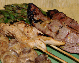 Marinate meat in our Oriental Marinade, for at least 2 hours, then skewer. Grill over a medium one-level fire until done, which will depend on what type of food you are cooking. Brush with satay sauce and finish over the coals until grill marks form. Serve with additional peanut sauce, and garnish with more chopped peanuts, fresh cilantro and/or red pepper flakes.